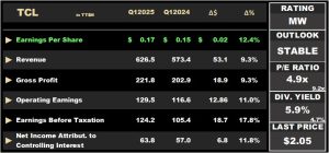 TCL is currently priced at $2.05 and trades at a price to earnings ratio of 4.9 times, below the Manufacturing Sector I & II average of 9.2 times. The stock currently offers investors an attractive dividend yield of 5.9% relative to a sector average of 4.7%. The Group announced a final dividend of $0.12 per share, to be paid to shareholders on 23rd September, 2025. This follows the resumption of dividend payments in September 2024, the first distribution since July 2017.