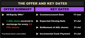 - Swap Rate: 1 AGL Share received in exchange for every 4.8 PHL Shares