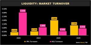 Taking a look at the traded volumes of PHL and AGL over the past four years – in 2021 and 2022, AGL demonstrated significantly higher market turnover compared to PHL, indicating a more active trading environment for AGL during those periods. Specifically, AGL’s turnover was 3.0% in 2021 and 1.1% in 2022, while PHL’s turnover remained below 1.0% in both years. AGL’s liquidity, as measured by turnover, moderated in recent years (2023 and 2024), while PHL saw an increase in its market activity during the latter period. For 2024 PHL showed a turnover rate of 1.3%, while AGL stood at 0.9%.