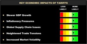 The full implementation of US tariffs could have significant regional and global consequences. While the reported intent of these tariffs involves a revival of US manufacturing, protecting American industries and job creation, the near-term impact is likely to drive input costs higher for US manufacturers reliant on imported materials, which will likely result in increased consumer prices. The general consensus economic forecast would include slow-to-no growth combined with increased inflationary pressures; a phenomenon commonly referred to as ‘stagflation’.