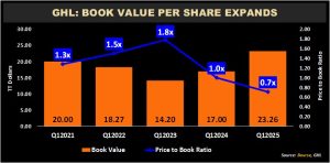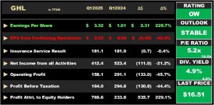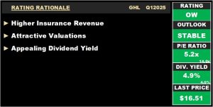 From a value perspective, GHL’s book value per share advanced from $17.00 in Q12024 to $23.26 in the current period under review. GHL’s price to book ratio moved from a high of 1.8 times in Q12023 to a low of 0.7 times in Q12025 (below its five-year average of 1.3 times). This implies that investors are currently paying less on a per-share basis to own net assets of the company, often interpreted as an indicator of value.