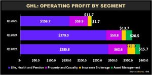 Life, Health and Pension (LHP) (68.5% of operating profit excluding adjustments) declined 42.8% year on year from $279.0M to $159.7M, primarily due to higher insurance finance expenses (despite revenue growth). The Property and Casualty Segment improved 17.9% to $59.9M in Q12025, with higher insurance revenue particularly achieved from Trinidad and Dutch Caribbean operations. Insurance Brokerage dipped to $11.7M, due to lower income from investing activities. Asset Management saw the largest decline, slipping 91.7% from $20.5M in Q12024 to $1.7M in Q12025.