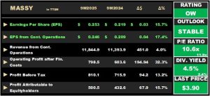Massy Holdings Limited (MASSY) reported Earnings per Share (EPS) of $0.253 for the nine months ended June 30th, 2025 (9M2025), 15.7% higher than the $0.219 reported in 9M2024. EPS from Continuing Operations grew 17.4% from $0.209 to $0.246 per share.