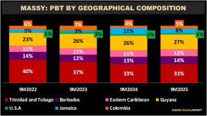 Trinidad & Tobago, the largest contributor to PBT before adjustments (32.7%), rose 6.9% year-on-year, moving from $297.9M to $318.4M. Guyana’s share of PBT (26.7%) grew by 10.6%, from $234.5M in 9M2024 to $259.5M in the current reporting period. Guyana’s overall contribution to PBT ex-adjustments grew from 26% to 27%.