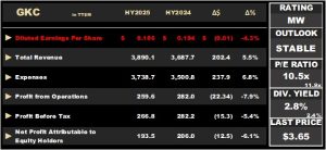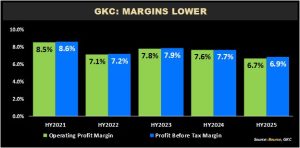 For six-month reporting period ended June 2025 (HY2025), GKC’s profitability margins narrowed relative to the prior comparable period (HY2024). Operating Profit Margin fell from 7.6% in HY2024 to 6.7% in HY2025, while Profit Before Tax Margin dropped from 7.7% (HY2024) to 6.9% in the current period, despite cost-optimization initiatives. GKC’s margins currently hover at the lower end of its trailing five-year range.