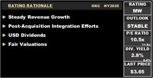 GKC continues to broaden its portfolio by pursuing strategic acquisitions, diversifying revenue streams and focusing on the integration of existing acquisitions. On the basis of revenue growth and continued acquisition activity, but tempered by lower margins, Bourse maintains a MARKETWEIGHT rating on GKC.