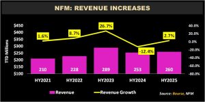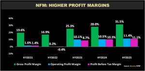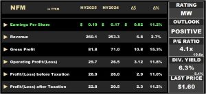 Revenue of $260.1M was recorded, up 2.7% from last year’s $253M. Gross Profit rose 15.3% from $71M, on account of increased revenue and lower Cost of Sales. Selling and Marketing Expenses increased 22.5%, from $21.5M to $26.3M in HY2025. Administrative expenses experienced a $2.6M, or a 9.8% increase from $26.2M to $28.7M. NFM managed to produce an Operating Profit of $29M, an 11.8% increase from $26.5M for the same comparable period. Finance costs increased 49.1%, from $0.51M in HY2024 to $0.75M in HY2025. Taxation amounted to $6.1M, up 10.3% with the effective tax rate maintained at 21.0%. Profit Before Taxation grew to $28.9M in HY2025 from $26.0M, an 11% increase Year on Year. Profit after Taxation was $22.8M, up 11.2% from $20.5M in HY2024.