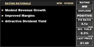 Revenue grew by 2.7%, a $6.8M improvement relative to the prior comparable period in HY2024. Revenue growth was achieved even after the Company’s conscious decision to lower product prices to consumers during the course in 2024. NFM also noted its relaunched Ibis brand and introduced ‘Ibis Bakers Flour’, expanding its product offerings and positioning the business for further revenue growth.