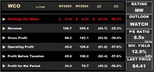 Once one of the most reliable and robust producers of dividends, WCO has experienced a consistent decline in dividend payouts over the past five years. Total dividends fell from $1.54 per share in FY2020 to $0.67 per share in FY2024, reflecting ongoing profitability headwinds. The Company declared a first interim dividend of $0.10 per share for HY2025, half of the $0.20 paid in the same period last year. Should the current earnings trajectory persist, shareholders may have to accept a possible lower overall dividend as the Company repositions itself in the evolving environment.
