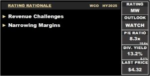 Investors remain watchful for clear evidence of stabilizing revenue and operating performance, cognizant of the headwinds faced by the Company. On the basis of continued revenue and margin pressures, Bourse revises its rating on WCO to MARKETWEIGHT with a WATCH Outlook.