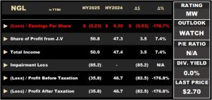 The Group’s Dividend Income declined to 48.5M from $110.3M, a 61.9% contraction. Other Income grew 13.9%, moving from $10.7M to $12.2M. Operating Expenses declined by 2.9% to $4.7M in the current period, from $4.8M in 9M2024. Operating Income fell by 54.1% to $50.8M in HY2025, mainly driven by the heavy decline of lower dividend income. NEL reported a Loss before Tax Expense of $182.0M for HY2025, increasing from a loss of $137.4M (9M2024). The Change in Fair Value of Assets amounted to $237.7M, a small improvement from $252.5M year-on-year. Tax expense increased by 3.0% to $3.5M. Overall, the Group recorded Total Comprehensive Loss of $185.5M, a 31.7% increase year on year.