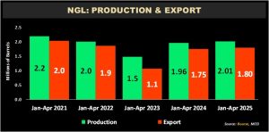For the period Jan – Apr 2025, NGL production rose 2.5% to 2.01M BBLS from 1.96M BBLS in the prior comparable period. Exports of NGLs by PPGPL increased from 1.75M BBLS to 1.80M BBLS (+2.8%) in the current period. This reflects continued improvement following the dip in both production and export volumes in 2023.
