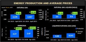 During the period October 2024 – April 2025 Natural Gas production in T&T averaged 2,557 mmcf/d, marginally lower than the 2,570 mmcf/d recorded in the prior comparable period. The average price of Natural Gas (based on Henry Hub pricing) saw a substantial improvement, increasing 42.6% from US$2.31/MMBtu for the period October 2023 – April 2024 to US$3.30/MMBtu in October 2024 – April 2025.
