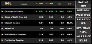 NEL’s Book Value Per Share (BVPS) dropped to $4.18 in HY2025, down 16.4% from $5.01 in the prior period, reflecting the change in fair value of its investee companies. With the accompanying fall in share price, the Group’s price-to-book ratio fell from 0.7 times in HY2024 to 0.6 times in the current period.