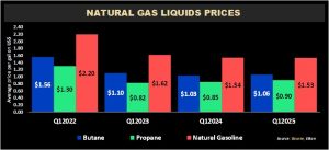 Average Butane prices grew 2.9% from US$1.03 per gallon in Q12024 to US$1.06 per gallon in Q12025, while average Propane prices gained 5.9% from US$0.85 per gallon to US$0.90 per gallon. Natural Gasoline dipped marginally to US$1.53 per gallon in Q12025 from US$1.54 in the prior comparable period. Year to date, the weighted basket of NGLs has averaged US$1.02 per gallon.