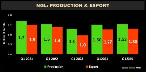 Production and exports of NGLs have shown a general downward trend from Q12021 to Q12023. However, a recovery was noted in Q12024 and Q12025.