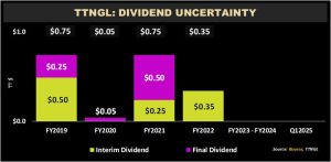 TTNGL has not declared any dividend payments since FY2022, largely as a result of unresolved regulatory limitations. While the company has emphasized its commitment to finding a sustainable solution, no firm plans have been announced. According to TTNGL in its 2024 annual report, a formal proposal is expected this year, subject to stakeholders and regulatory approvals.