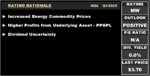Despite an improved first quarter performance, the Company continues to face near-term headwinds. Investor sentiment remains cautious, driven by concerns over the near-term energy production outlook and the palpable absence of dividend payments. The Company’s ability to resume dividends, however modest, will be key to changing investor perspectives on the stock. Accordingly, Bourse maintains a MARKETWEIGHT rating on TTNGL.