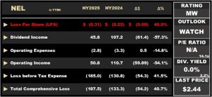 NEL reported a Loss per Share (LPS) of $0.31 for the six months ended 31 March 2025 (HY2025), wider than the Loss Per Share of $0.22 in the prior comparable period. Notably, included in this loss per share was a non-cash decline in fair value of assets amounting to $235.9M (2024: $241.5M).