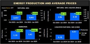 During the period October 2024 – January 2025 Natural Gas production in T&T averaged 2,661 mmcf/d, slightly higher than the 2,537 mmcf/d recorded in the prior comparable period. The average price of Natural Gas (based on Henry Hub pricing) remained stable at US$2.85/MMBtu for the period October 2024 – January 2025, unchanged from the previous year.