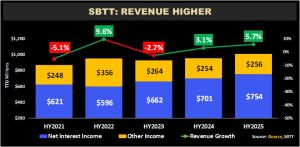 SBTT’s efficiency ratio improved to 41.7% in HY2025 from 42.6%, signaling enhanced operational efficiency. Non-interest expenses rose by $14.0M to $420.8M in HY2025. Looking ahead, the company’s ability to manage costs efficiently will be essential to sustaining future profitability.