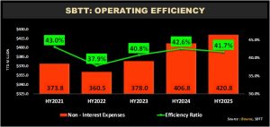 Net Interest Income rose 7.6% to $754.0M, while Other Income marginally increased 0.7% from $254.2M in HY2024 to $255.9M in HY2025. Total Revenue for HY2025 came in at $1.0B, a 5.7% increase from the prior period. Non-Interest Expenses shifted 3.4% higher from $406.8M in HY2024 to $420.8M in HY2025, likely due to inflationary pressures. SBTT recorded a 11.7% rise in Net Impairment Loss on Financial Assets, amounting to $63.0M (HY2024: $56.3M). Profit before Taxation (PBT) grew to $526.1M, relative to $492.0M recorded in HY2024. Taxation rose 10.4% to $186.0M from $168.5M in the prior comparable period. Overall, SBTT reported a Profit Attributable to Equity Holders of $340.1M, up 5.1% compared to $323.5M in HY2024.