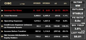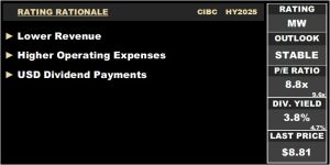 Investors should be aware that any additional cuts to U.S benchmark interest rates could place further pressure on topline performance. However, this impact may be partially offset by continued growth in loan volumes. On the basis of relatively fair P/E multiples and USD dividends, tempered by softening revenue and higher operating expenses, Bourse maintains an MARKETWEIGHT rating on CIBC.