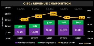 Total Revenue experienced a year-on-year (YoY) decline of 1.1%, moving from TT$2.50B in HY2024 to TT$2.47B in HY2025. Net Interest Income, which represents 72.2% of Total Revenue, improved marginally by 0.2% to TT$1,779B from TT$1,783B a year earlier. The Group’s loan portfolio advanced 8.1% from TT$45.2B in HY2024 to TT$48.8B in the current review period. Meanwhile, Operating Income (accounting for 27.8% of Total Revenue) declined by 4.2%, from TT$716M to TT$686M. According to CIBC, overall revenue performance was impacted by softer US interest rates, funding-related challenges, and unrealized losses from investments.