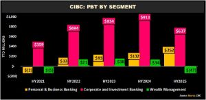 CIBC’s Profit Before Tax (PBT) drop by 23.1% Year over Year (YoY). The Bank’s largest contributor to PBT growth, Corporate and Investment Banking (74.3% of PBT), decreased 30.3% from TT$913M to TT$637M. Personal & Business Banking (PBB), contributing 29.4% to PBT, showed a significant improvement of 90.8% year-on-year, rising from TT$132M in HY2024 to TT$252M in the current period. The Wealth Management (WM) segment (5.5% of PBT) shifted from a profit of TT$34M in HY2024 to a loss of TT$47M in HY2025.